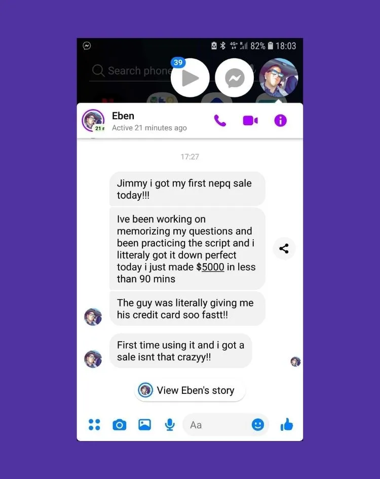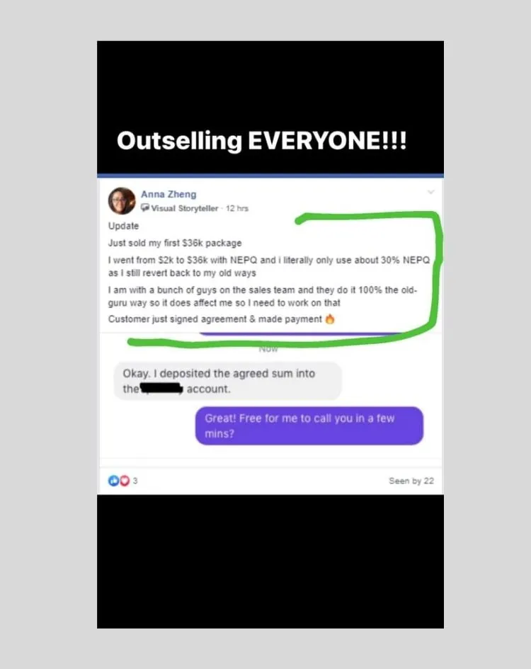 "I've actually now gone from selling anywhere from $3k to $5k packages all the way up to $30k to $35K packages. I wasn't selling anywhere above $5k before NEPQ"