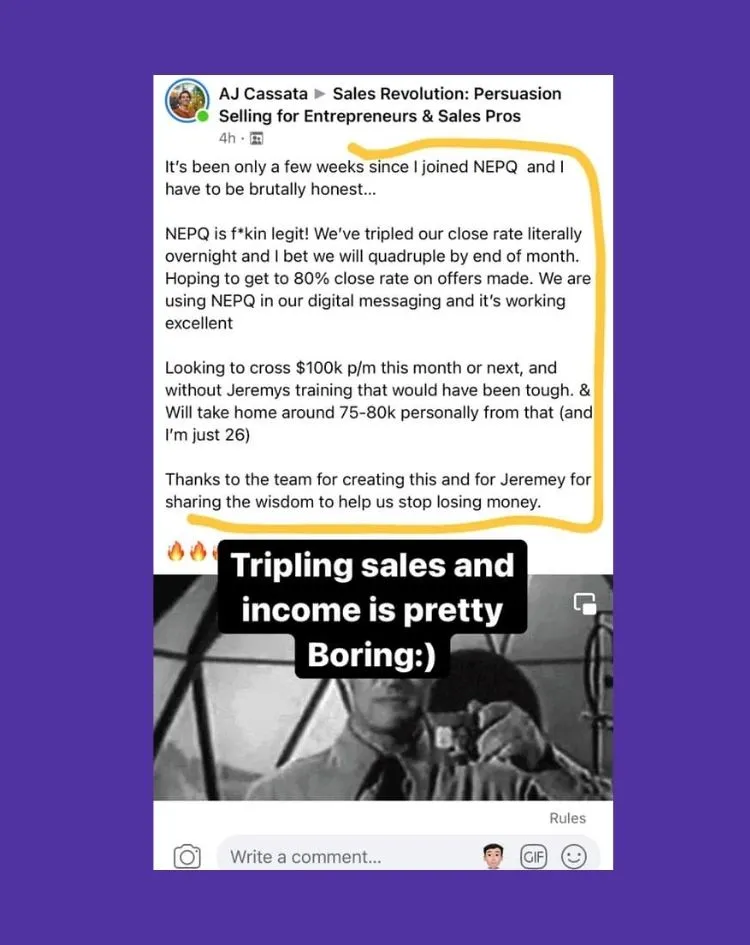 "I just had my best month in December and it was all due to Jeremy, Matt, and all the team at NEPQ because I wouldn't have been able to learn the skills to do that. And for me, it was the lack of skills that was getting me."