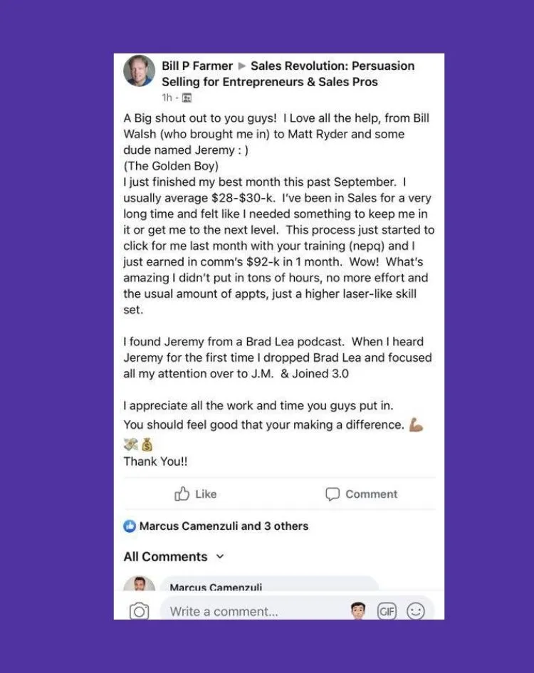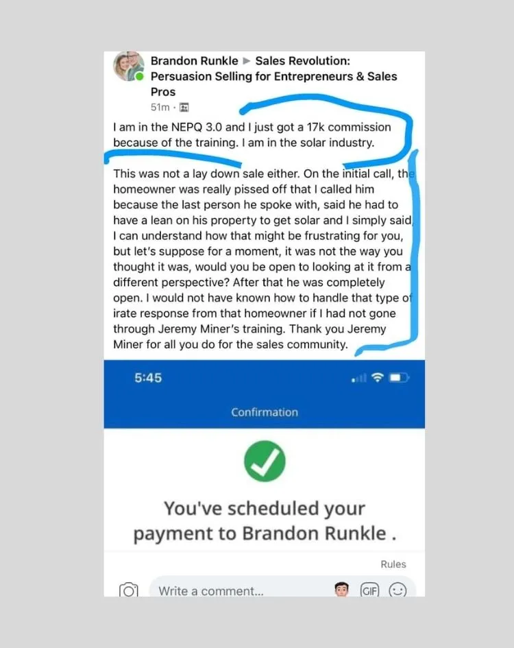 "I got a $25K paid in full. Like, paid in full! In the past two years, I've never really gotten paid in full this was a different way of selling. I've since collected more paid in fulls, more sales, and made more commissions than I ever made in the past, thanks to Jeremy."
